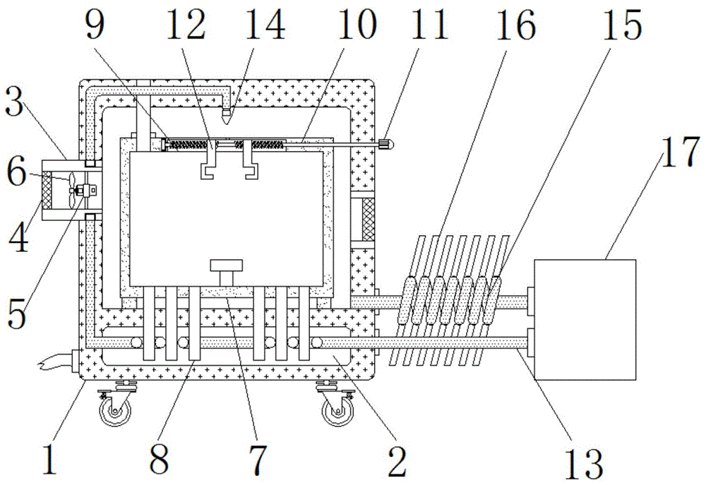 圖中:1、鍍膜機外壁;2、空腔;3、排風管;4、過濾網(wǎng);5、驅(qū)動電機;6、扇葉;7、鍍膜機內(nèi)壁;701、導(dǎo)流槽;8、導(dǎo)熱片;9、滑動槽;10、螺紋桿;11、調(diào)節(jié)旋鈕;12、基片夾板;13、進水管;14、霧化噴頭;15、排水管;16、散熱鰭;17、冷卻機。